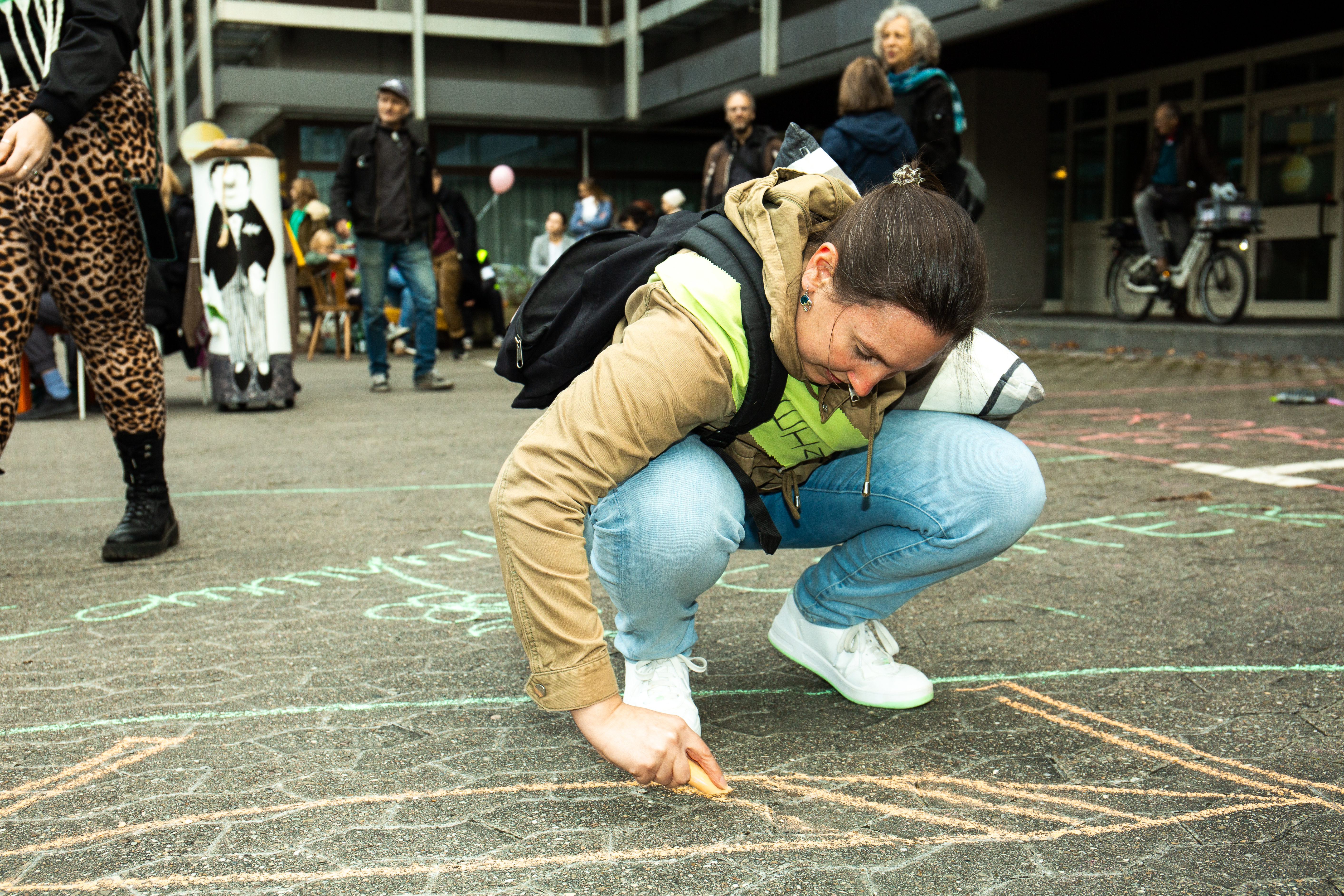 IlluMayha zeichnet live. Besucher*innen, Aktivist*innen, Passant*innen sind eingeladen ihre Fantasien mit IlluMayha zu teilen und erhalten im Gegegzug ihr individuelles Ortsporträt.